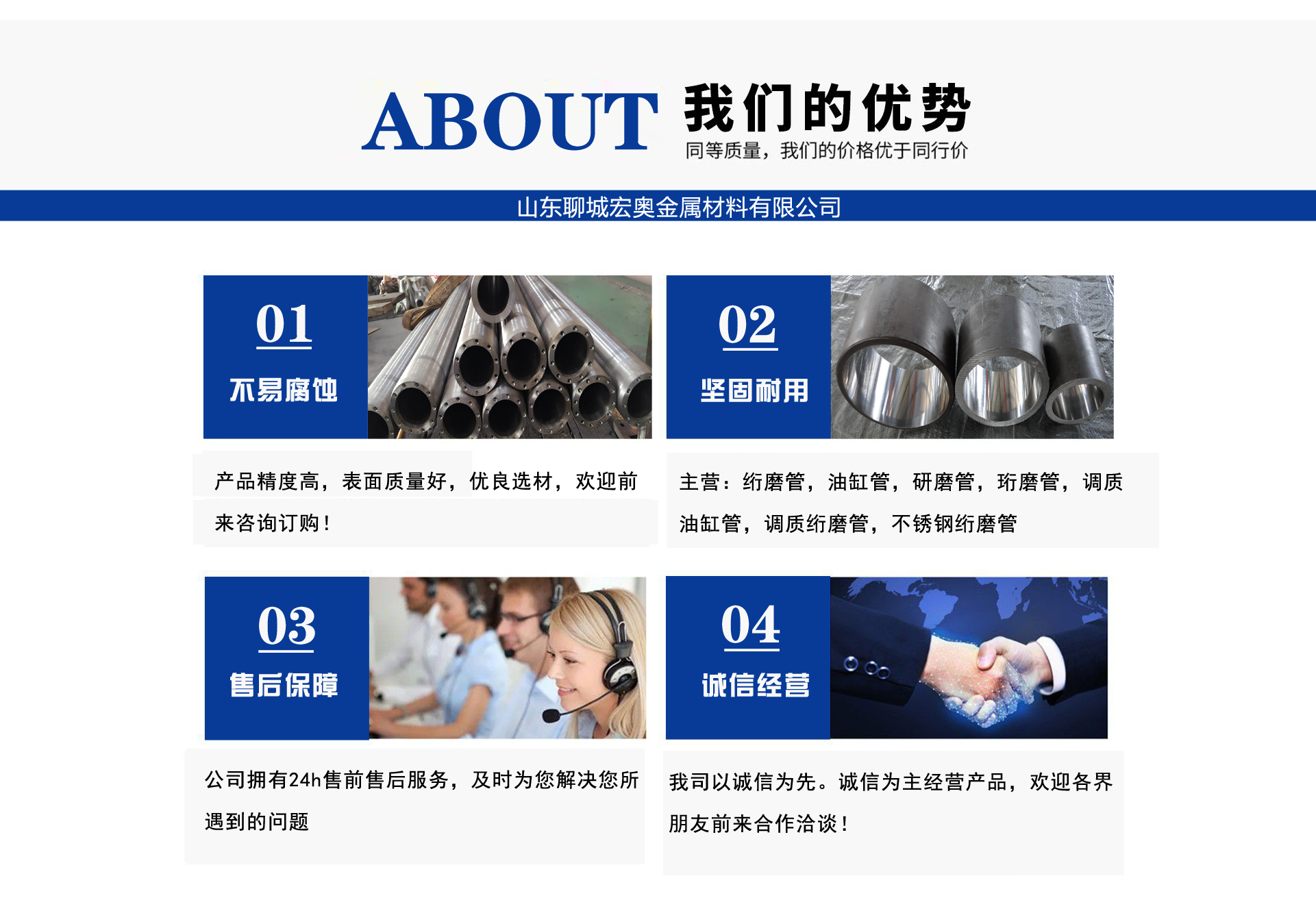 山東聊城宏奧金屬材料有限公司位于風景秀麗的江北水城-聊城。地理位置優越,交通便利。主營絎磨管,油缸管,研磨管,珩磨管,調質油缸管,調質絎磨管,不銹鋼絎磨管等產品 廣泛應用于礦山、起重、船舶、煤炭、運輸、化工、科研、軍工等工業領域?! 」緫{借雄厚的實力,豐富齊全的規格品種,完善的質量保證,合理的價格,優質的服務,不斷地受到新老用戶及業內人士的肯定和信任,我們本著及用戶之所及,想用戶之所想的服務宗旨不斷地拼搏,進取,在此對多年來支持我們的各行各業的新老朋友表示由衷的感謝,愿我們今后的合作更加愉快! 歡迎國內外新老客戶來公司視察、蒞臨指導工作!...